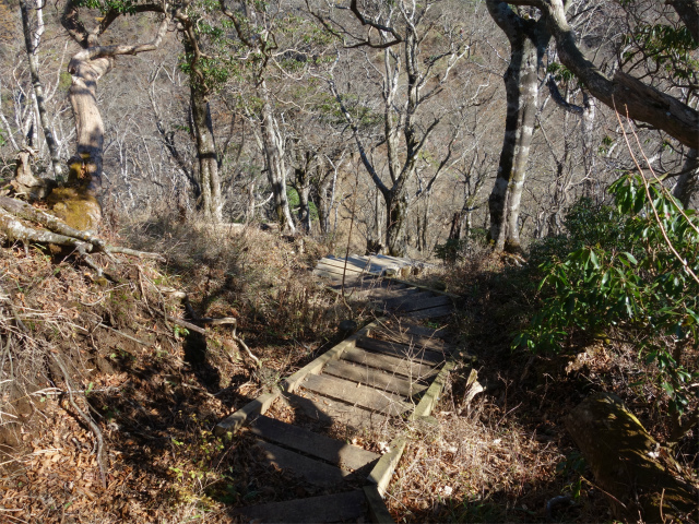 ミカゲ沢ノ頭のピークを越えて階段を下ると蛭ヶ岳を前に痩せ尾根を通過します。