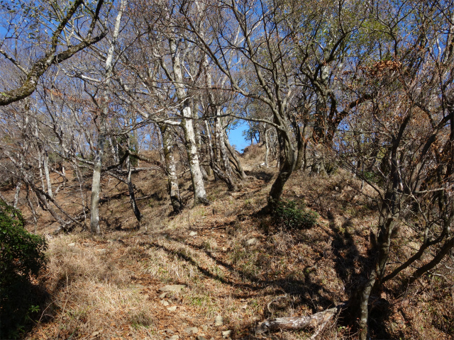 左手に木間から丹沢主稜を見ながら薄い踏み跡を辿ります。