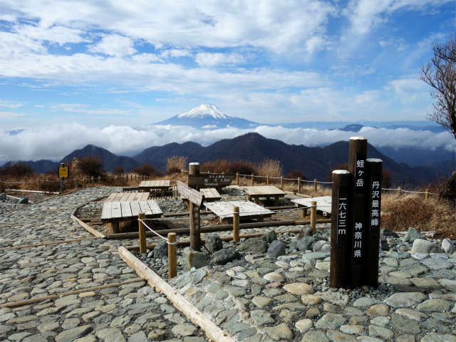 崩落地上部を通過し、階段が続く斜面を登り上げると臼ヶ岳から1時間20分ほどで蛭ヶ岳山頂です。
