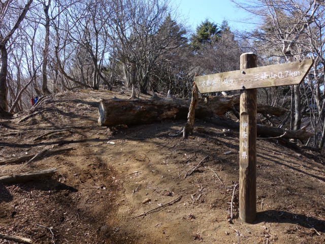 山頂から30分ほど、東峰を下り鞍部から緩やかに登ると不動尻1.4km案内板があり稜線の道と分岐します。稜線の道は正規の登山ルートではないものの大山方面へ向かうことができます(後述)。