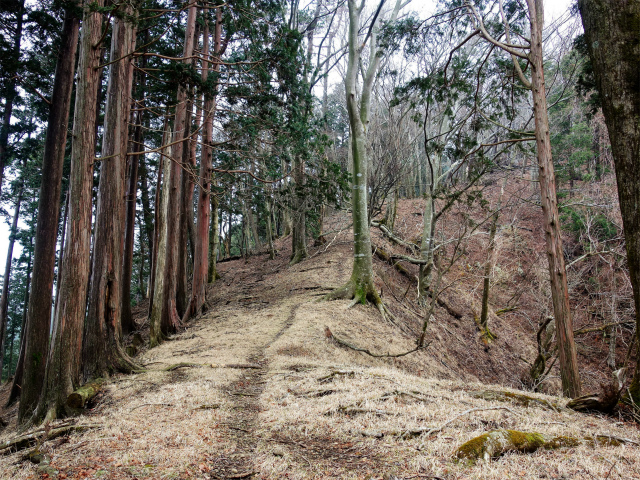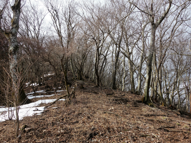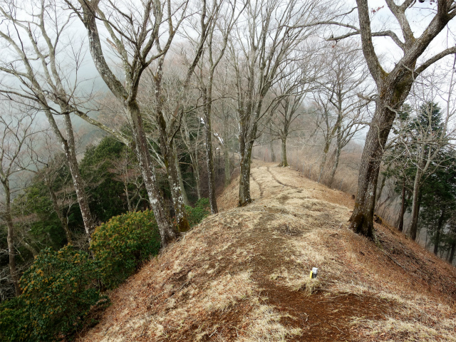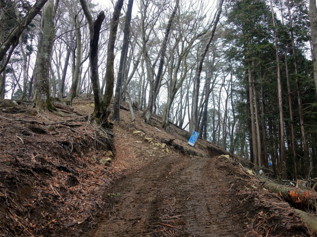 再びブルドーザー道に合流して左手へ進むと小ピーク付近に分岐があり、左側の道脇から踏み跡明瞭な登山道が尾根に続いています。