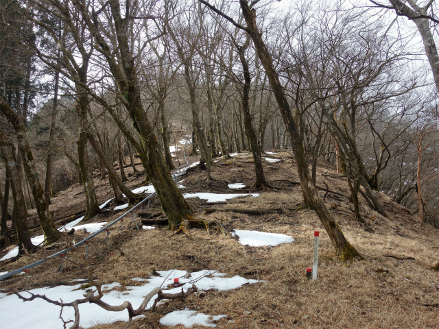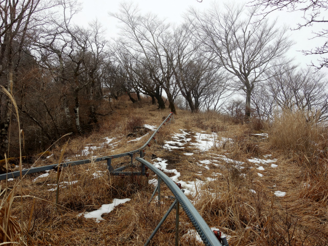大山を正面に見ながら下るとロープが掛けられた滑りやすい急坂を通過します。