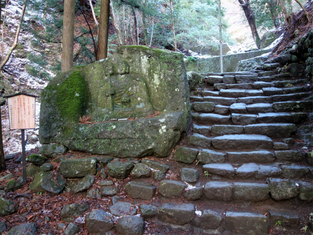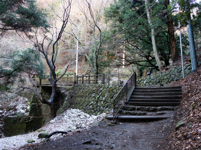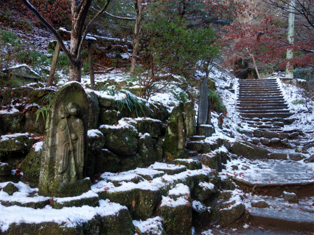弘法水の脇を通り橋で沢を渡り、地蔵の点在する階段を登ります。