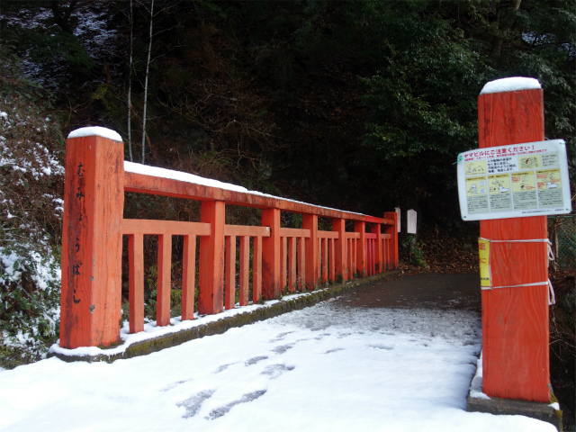 大山寺の右脇から登山道方面へ進み、トイレの先で赤い無明橋を渡ります。