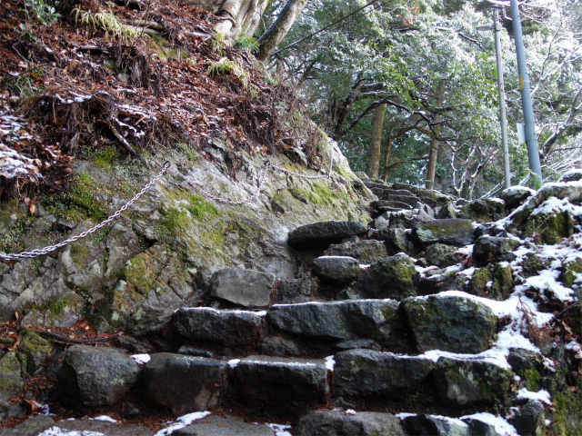 階段の急登が続き、補助の鎖がつけれらた区間を過ぎると男坂と合流します。