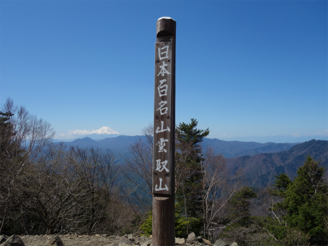 山頂標の背後に富士山や奥秩父、南アルプスの山々を見ることができます。