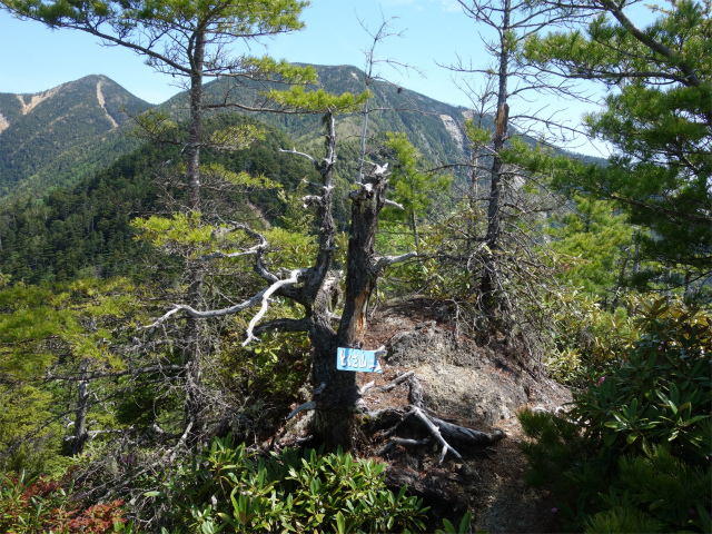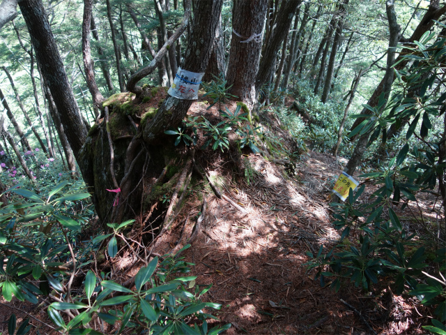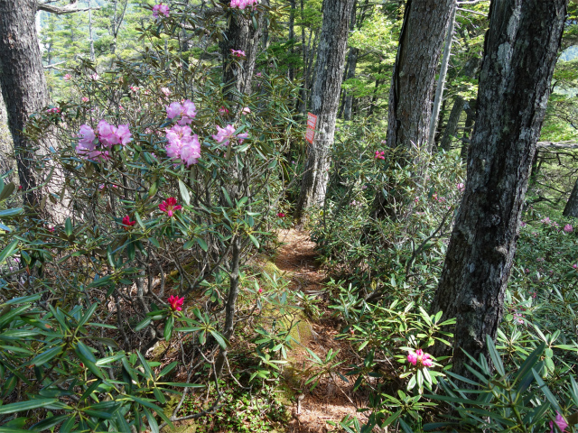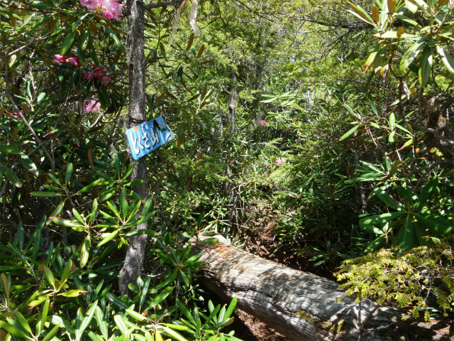 やがてシャクナゲが見られるようになり、1680m付近の尾根の合流点にはしっかりとした指導標が設置されています。