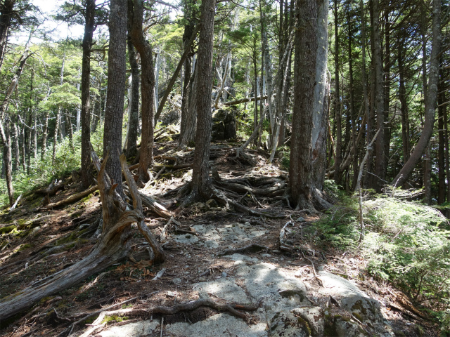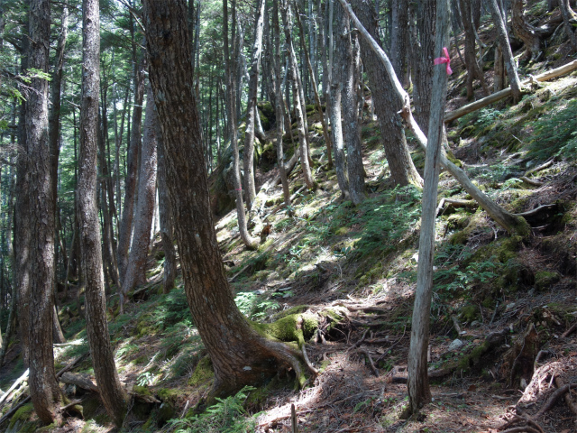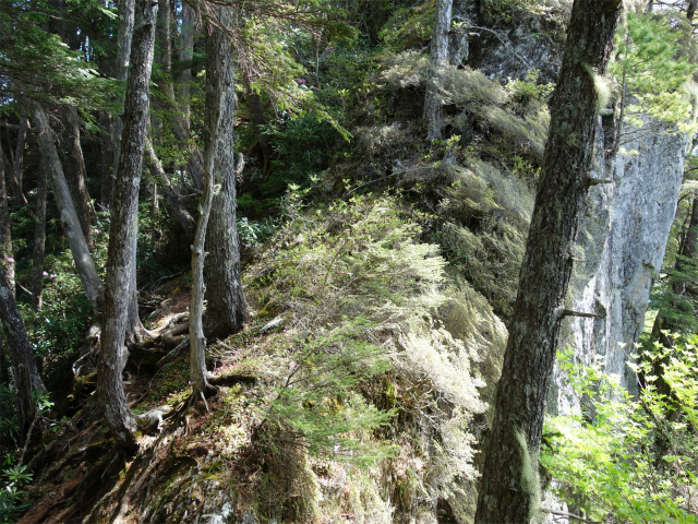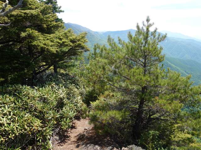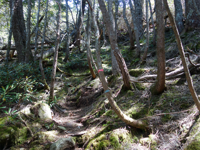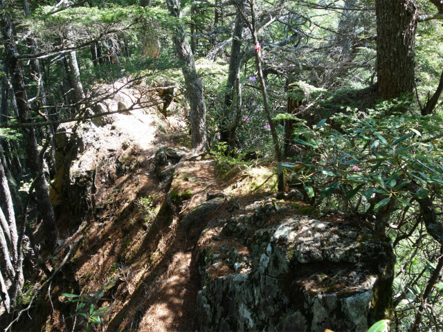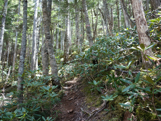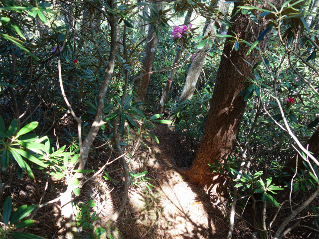 シャクナゲの藪を抜けたところで稜線の左側をややトラバースするように進みますが、一部踏み跡がわかりづらい箇所もあります。