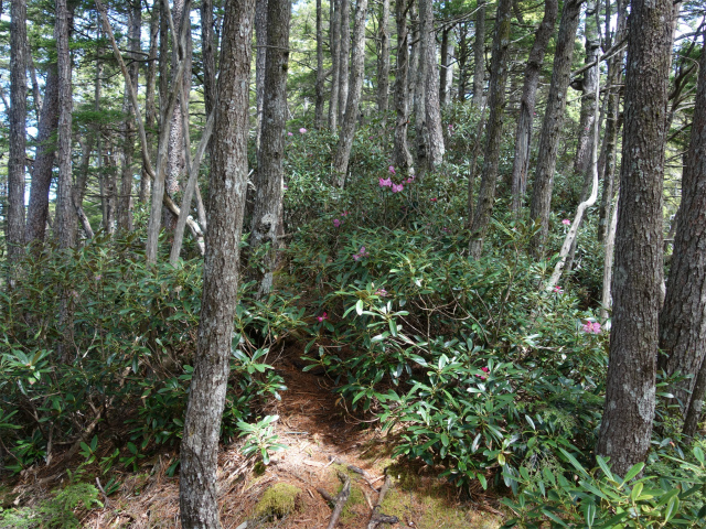 露岩の多いアップダウンが続き、シャクナゲの群生する稜線上を進みます。