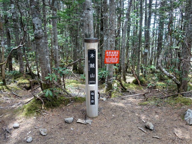 小振りなシャクナゲが多い緩斜面に出ると程なく木賊山の山頂標裏に出ます。
