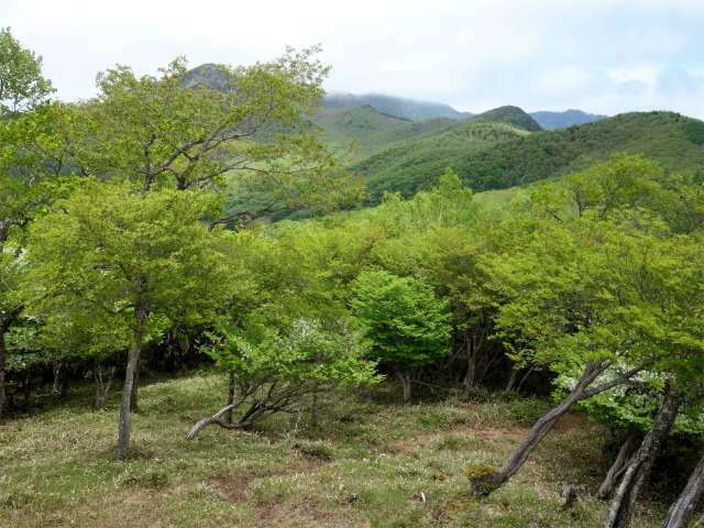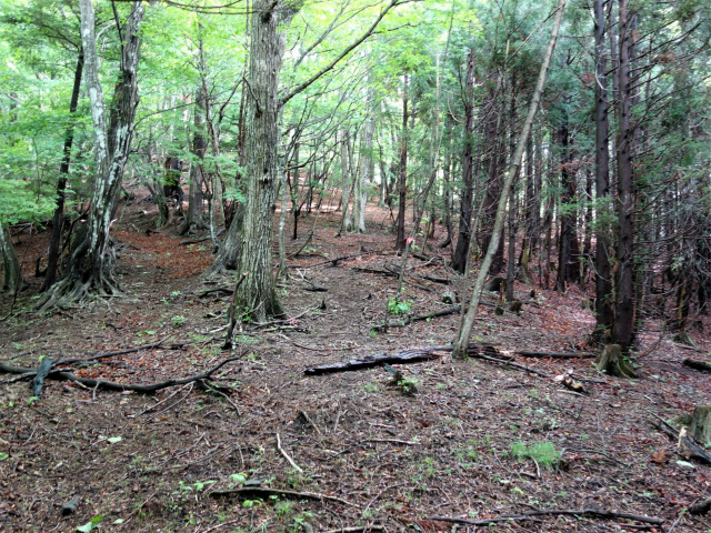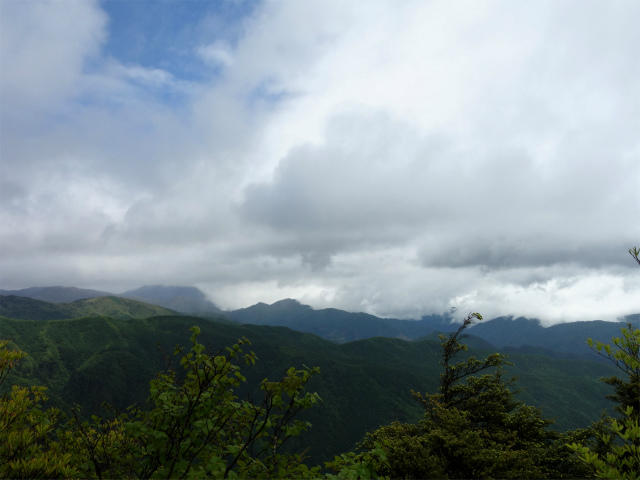 右手前をわずかに下り稜線上を進むと樹林の切れ目から東側の展望も見えるようになります。