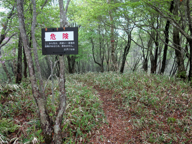 小ピークを左側に巻き気味に進んだ後、ひと登りすると1549m峰のピークに出て袈裟丸山を見渡します。ピークの手前には下り方面は危険のプレートが掲げられています。