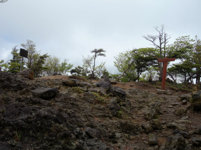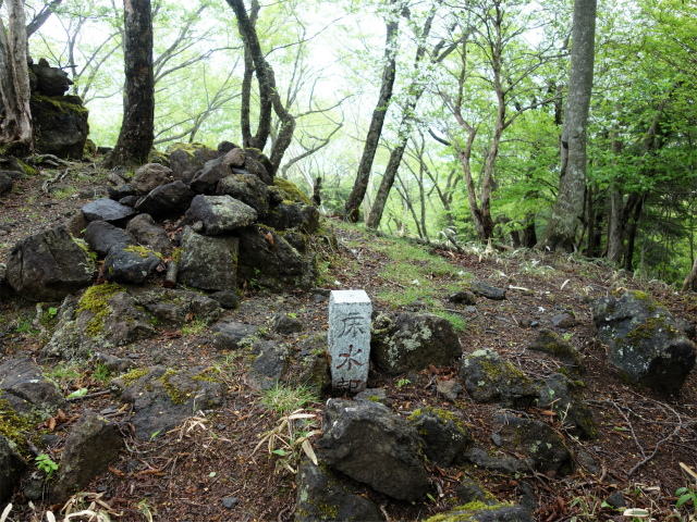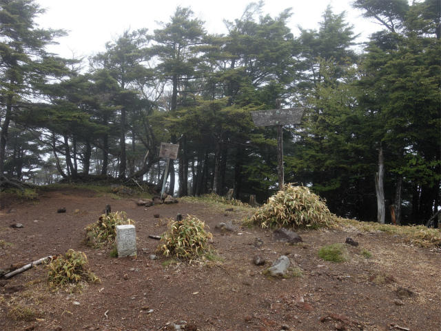 ケルンの並ぶ平場からなだらかに登ると左手に雨量計を見て、床水祀の石柱がある1609mのピークを越えます。
