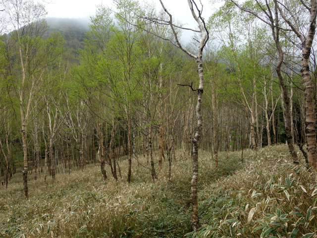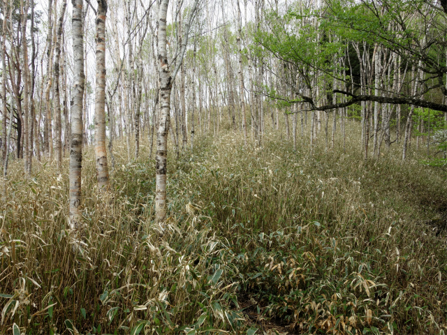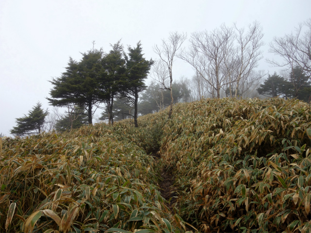 笹薮の広がる1685mピークは山頂をふまず左側を巻くように進みます。