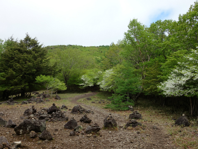 なだらかに鞍部へ下ると再びケルンが並ぶ平場があります。