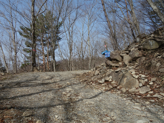 登山道を進むと古い作業道を横断し、国師ヶ原へと続く林道に合流します。