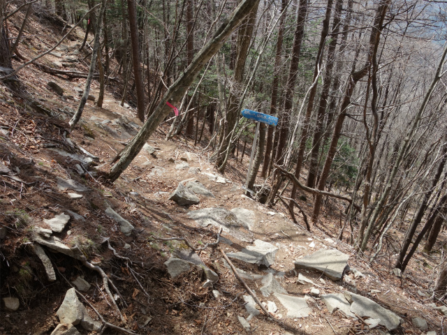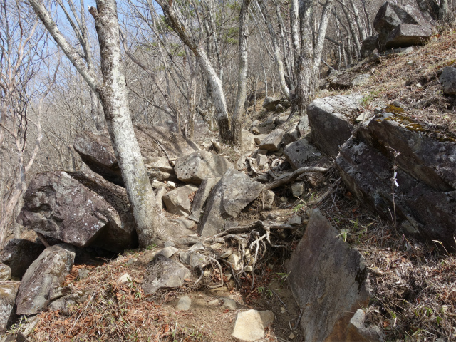 迂回下山道に入ると岩が転がる歩きにくい急斜面の下りが続きます。