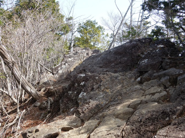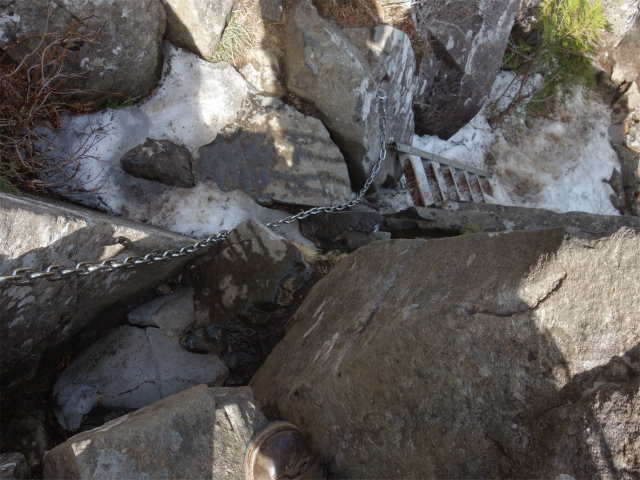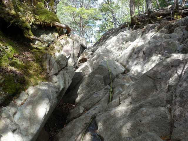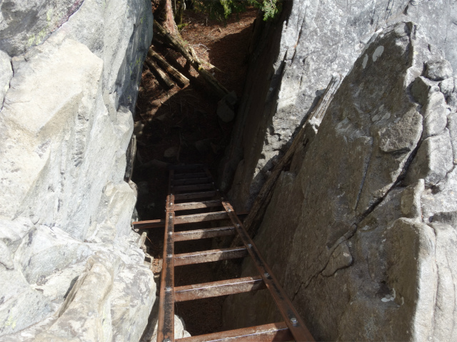 髭剃岩を右手から巻いて岩場を登り、岩の割れ目の梯子を下ります。