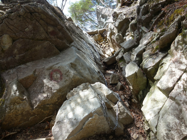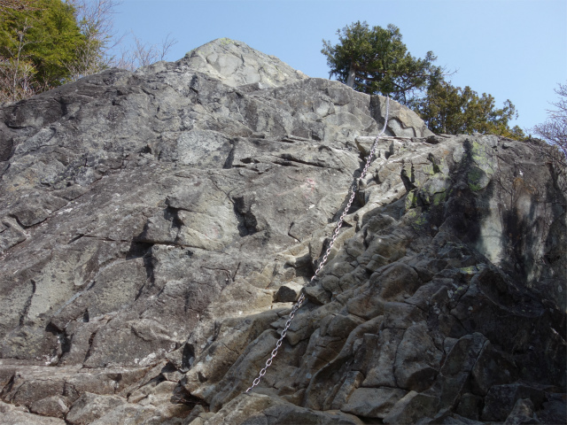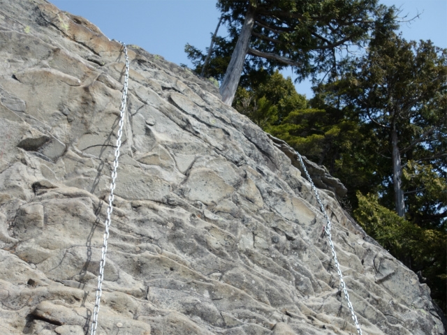 山頂直下の鳳岩(おおとりいわ)には20mの鎖場があります。