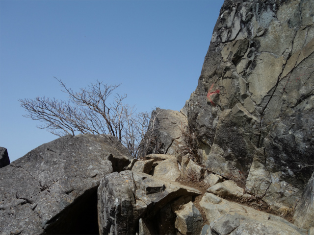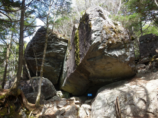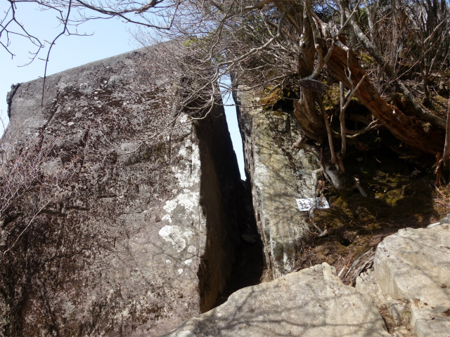 岩の合間の鎖場を経て、2本目の鎖場を登りきると大きな割れ目が特徴の髭剃岩の前に出ます。