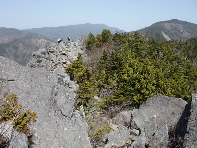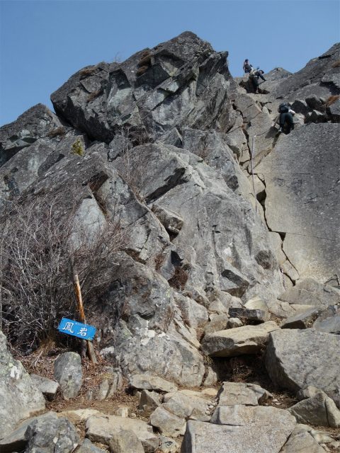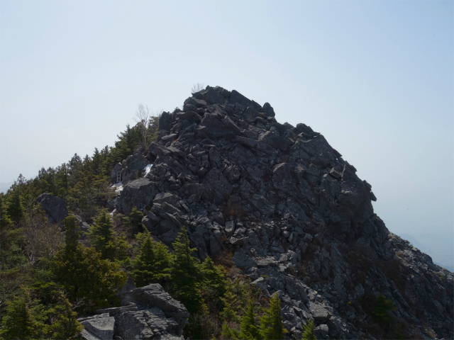 山頂直下の鎖場と梯子を下ると、岩稜上から山頂の岩峰を見渡せます。