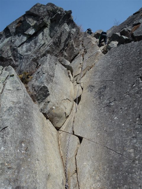 続くカミナリ岩にはテラスを挟んで2つの鎖場があります。
