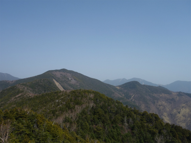 やがて傾斜が緩やかになり、樹林が開けたところから南アルプスなどが覗くようになります。