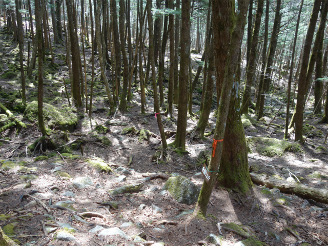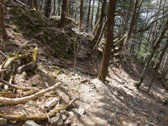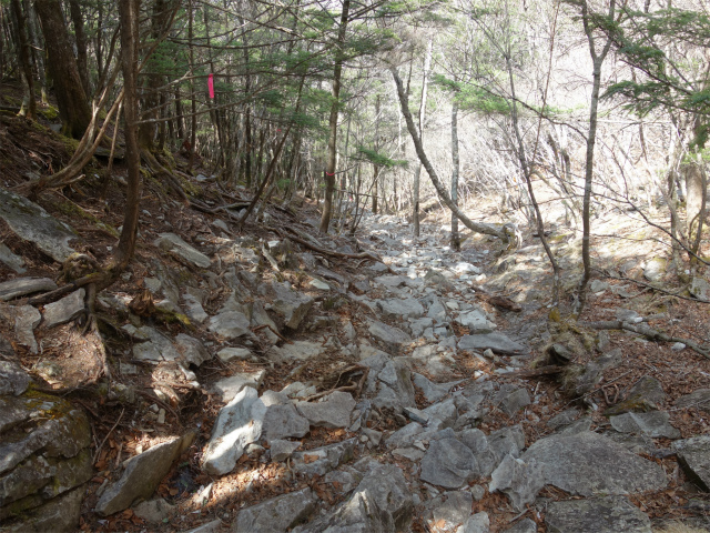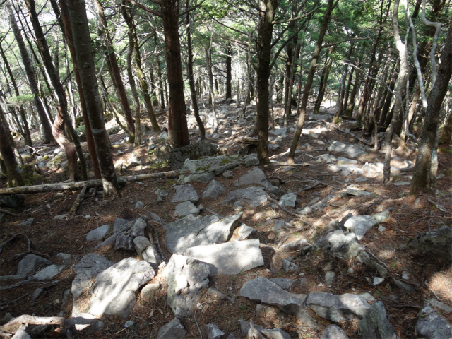 扇平を過ぎると樹林帯の中の岩が転がる急斜面となります。