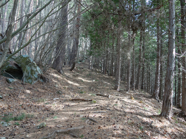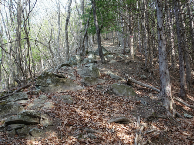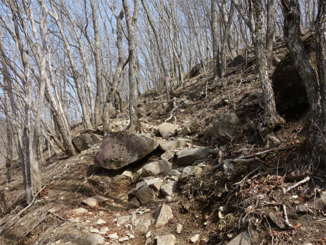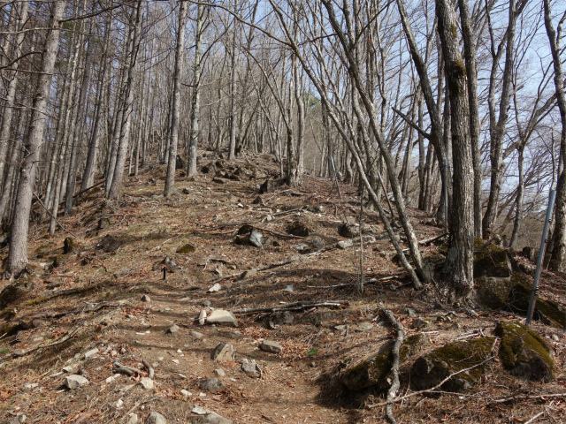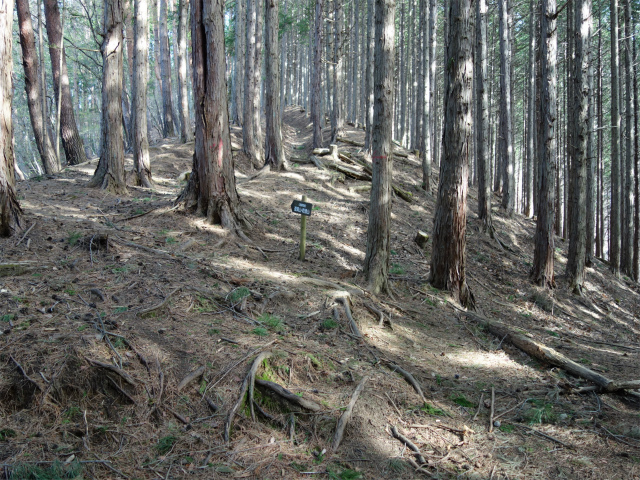 植林の尾根筋に出て右手にトラバースの踏み跡を見送り、岩の多い急斜面を登ります。