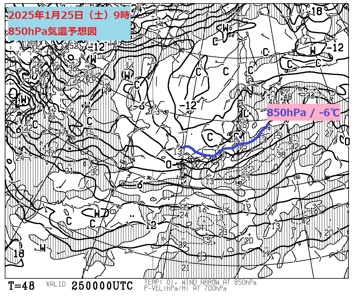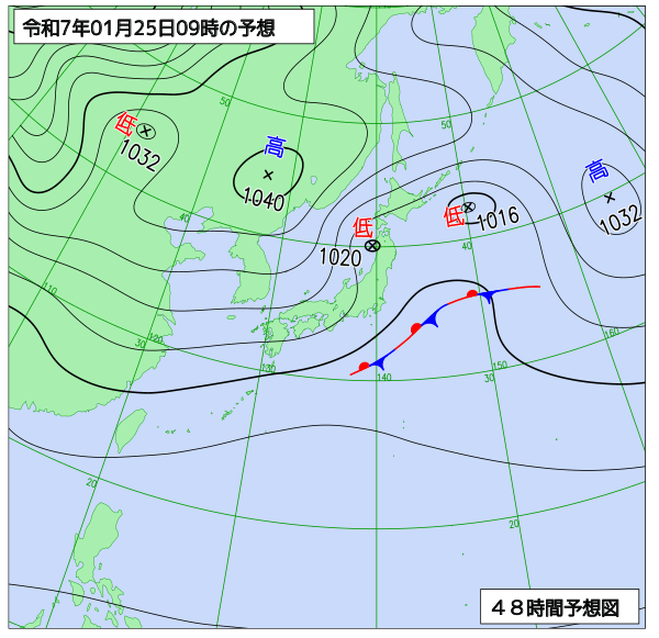 まずは1月25日(土)9時の地上予想天気図です。