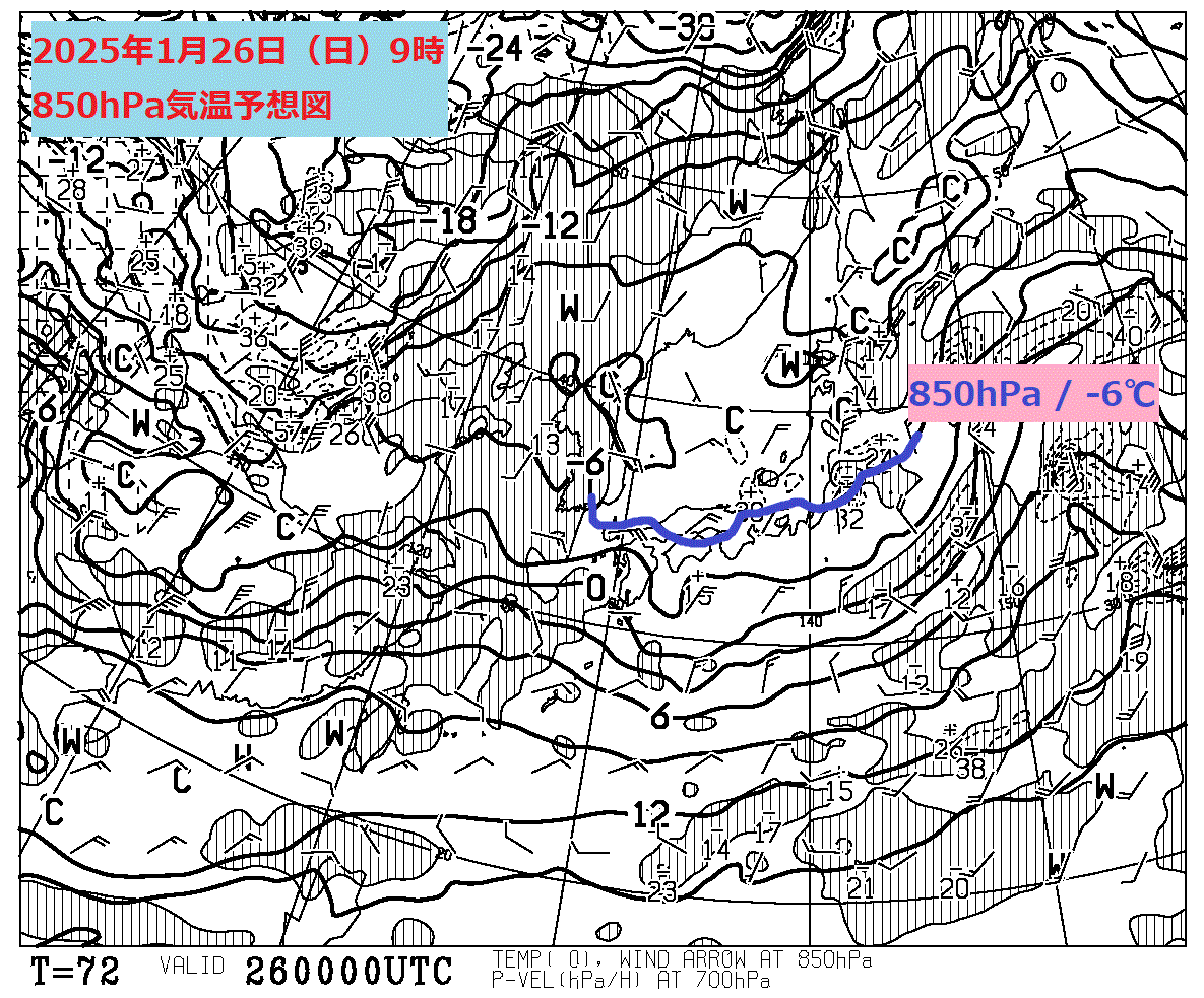 1月26日(日)9時の850hPa気温予想図を見ると、平地で雪になる目安となる850hPaで-6℃以下の寒気は引き続き東・西日本の日本海側より北の地域を覆うことがわかります。1月26日(日)の東日本日本海側は雪が降り、太平洋側は冬晴れとなるでしょう。
