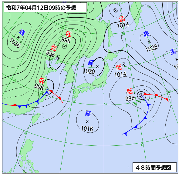 まずは4月12日(土)9時の地上予想天気図です。