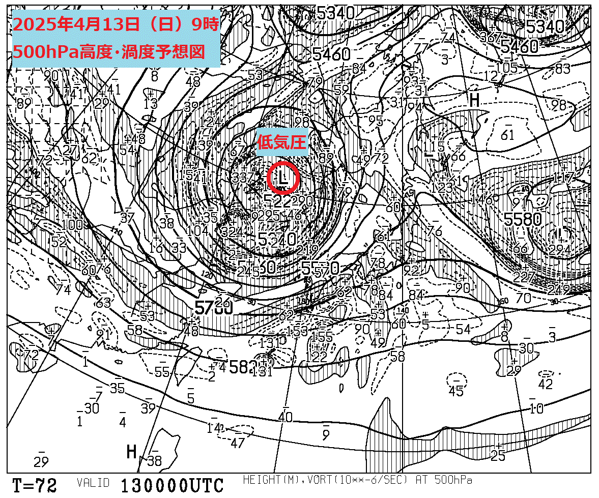4月13日(日)9時の500hPa高度・渦度予想図では、上空に寒気を伴った低気圧が西から近づくことがわかります。この低気圧の影響で、13日(日)の東日本は傘の出番となるでしょう。土日のどちらかでお出かけを予定されている方は、土曜のほうがおすすめです。