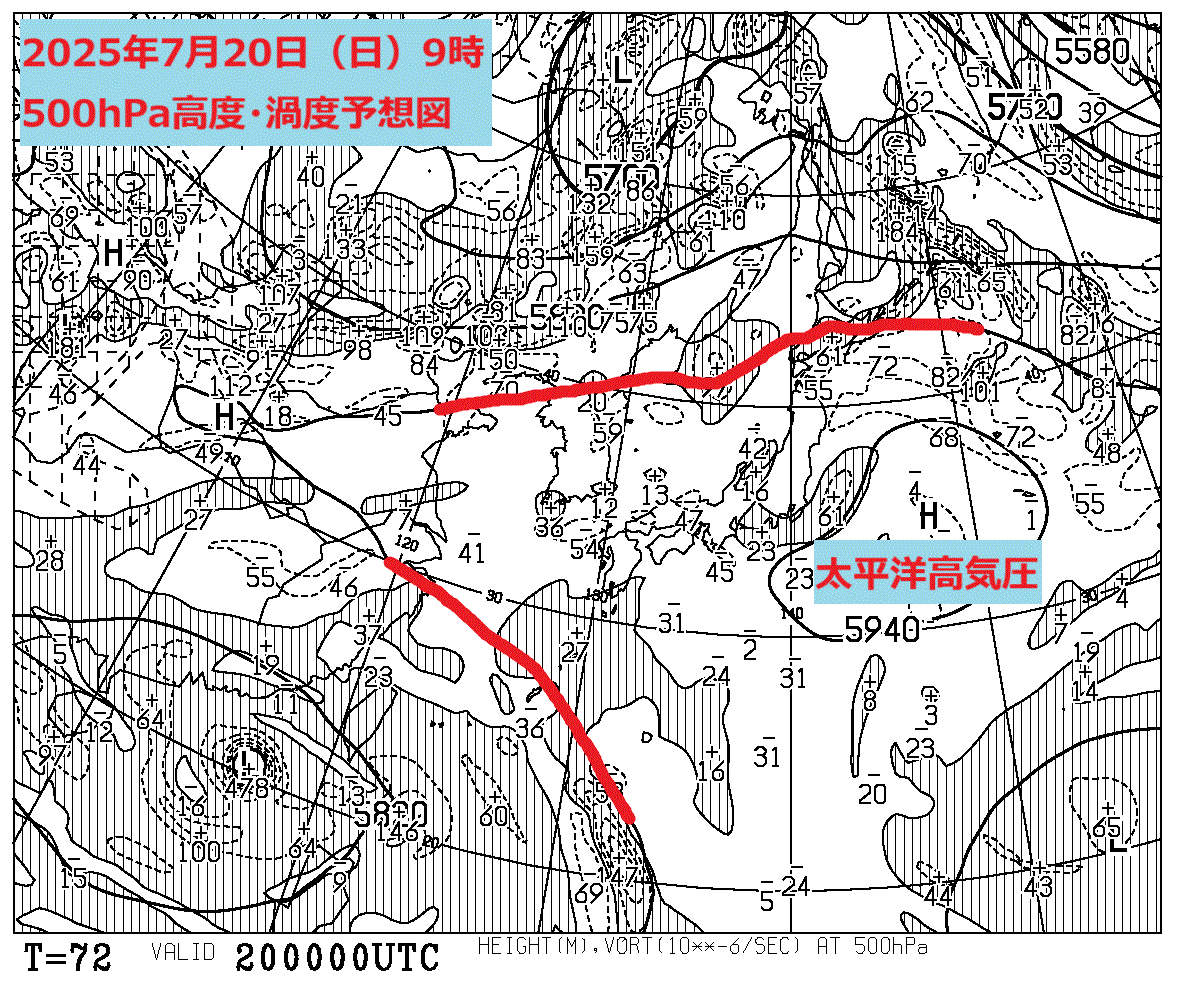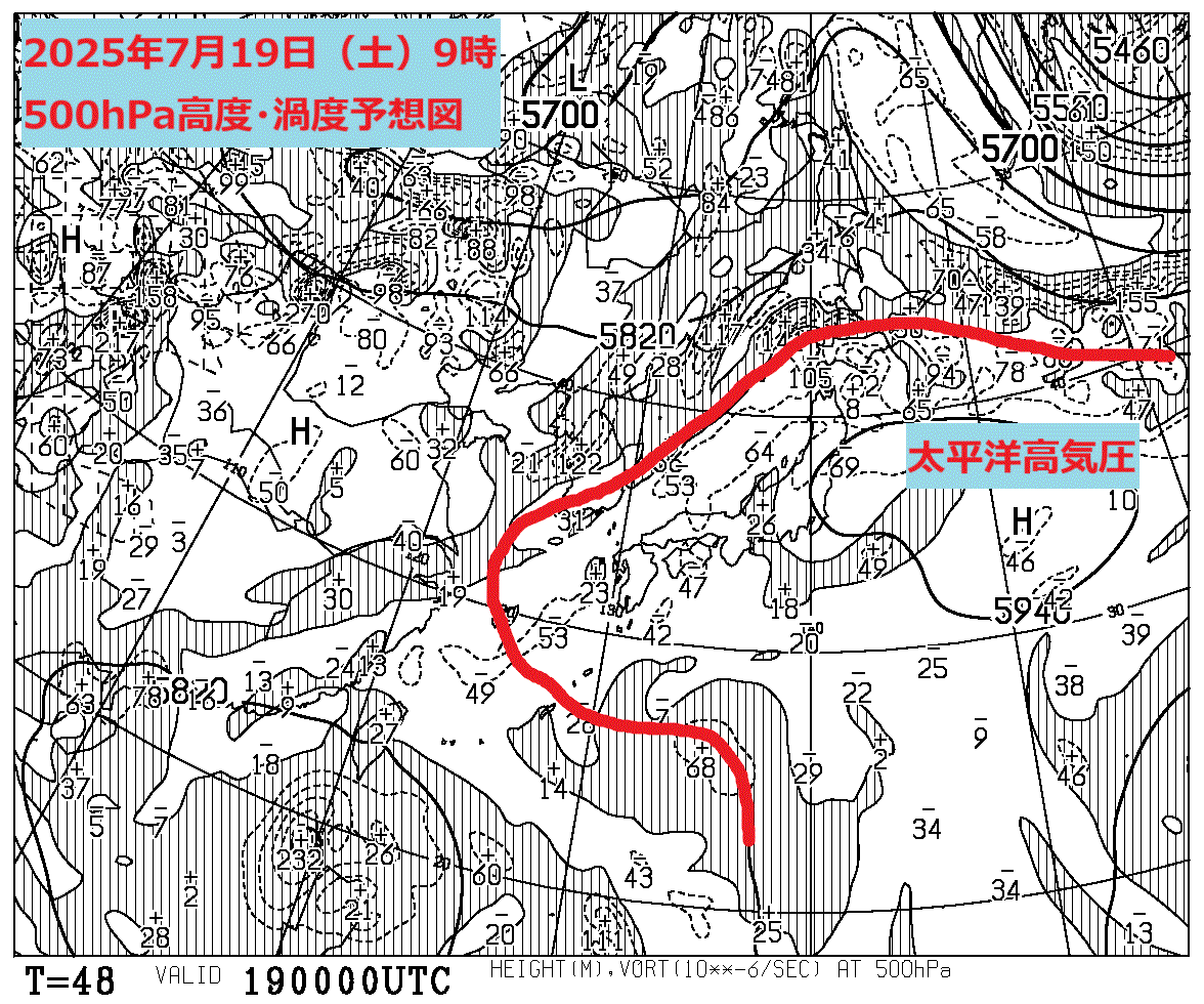 7月19日(土)9時の500hPa高度・渦度予想図では、東から太平洋高気圧が張り出し、九州~東北の広い範囲が太平洋高気圧の勢力圏となる500hPa=5880m以上の領域に覆われるでしょう。特に、東北南部や関東の太平洋側では、一段と強い500hPa=5940m以上の領域がかかる予想です。太平洋高気圧に覆われるため、7月19日(土)の東日本は真夏らしい晴天となりますが、午後は山沿いで雷雨となる所があるでしょう。