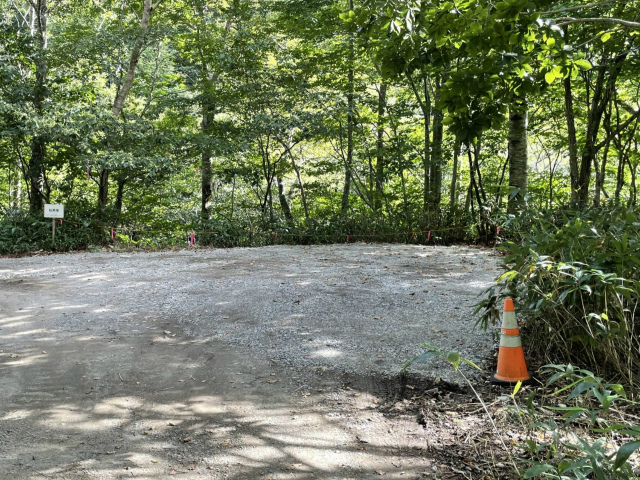 那須連山の北麓にある観音沼から大峠林道を進んだ先にある林道終点手前の駐車スペース(標高1295m)。アクセスは東北道の白河インターチェンジを下りて国道4号線(奥州街道)の郡山方面へ進みすぐの交差点を下郷・甲子温泉方面へ左折、国道289号線(甲子道路)との交差点を下郷方面へ左折する。甲子トンネル・道の駅しもごうを過ぎた先で観音沼森林公園の道標のある分岐を左折、つき当たりを案内に従い左折して道なりに進むと野際新田集落を過ぎた先で林道に接続する。林道は日暮滝を過ぎた先の駐車スペース1.1kmほど手前より未舗装路となる他、野際新田集落より先は冬期閉鎖となる(国道から分岐する道も冬期通行止)。林道を終点まで進むと那須連山最高峰の三本槍岳へ登る最短の登山口がある。