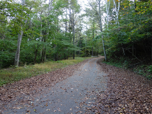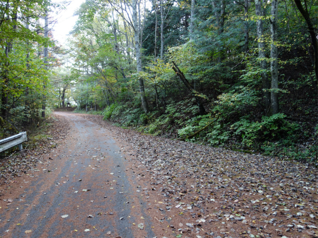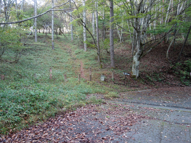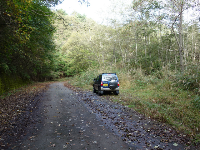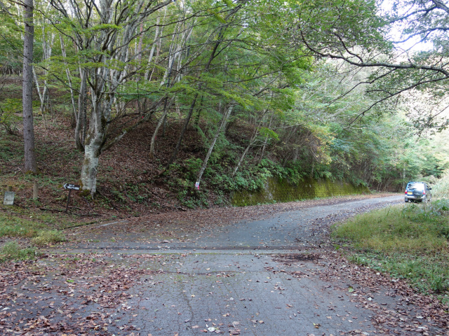 山梨百名山の一つ帯那山アヤメ群落地入口にある水ヶ森林道沿いの路肩スペース(標高1340m)。アクセスは中央道の勝沼インターチェンジを下りて国道20号線の東京・大月方面へ向かい、すぐに側道の県道306号線の勝沼市街方面へ左折、相興の交差点で県道303号線の山梨方面へ右折、道なりに国道140号線方面へ進む。国道との交差点を直進して西関東道路(国道140号線バイパス)を秩父方面へ右折、八幡南ランプより積翠寺・太良峠方面へ左折し、太良峠より水ヶ森林道(クリスタルライン方面)へと右折する(もしくは昭和甲府インターチェンジより甲府市街・武田神社を経て県道31号線を北上する)。休牧中の帯那山高原牧場の分岐を過ぎた直後のゲートから1.1kmほど先の登山口前後の道幅が広がる箇所に駐車余地がある。林道は全線舗装されており乙女高原まで通じているが、12月から4月下旬にかけて冬期通行止となる。