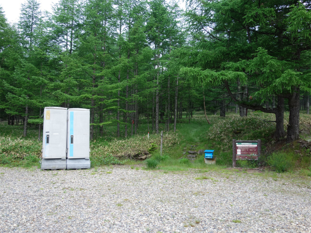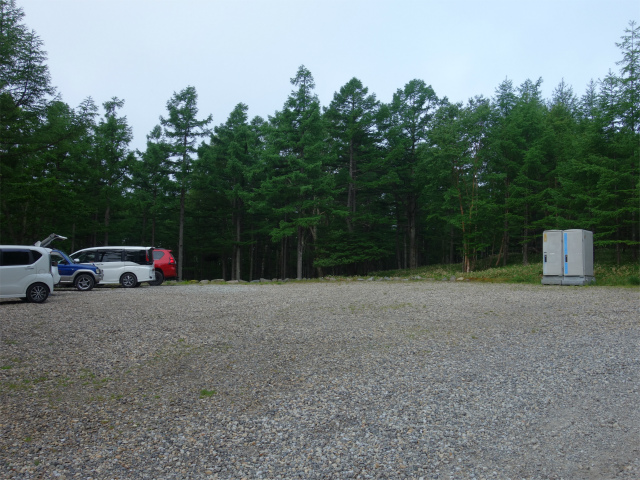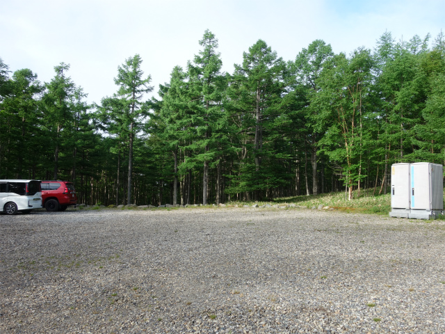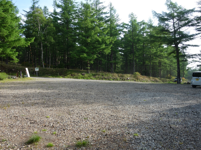 八ヶ岳の赤岳県界尾根の登山口にある南八ヶ岳林道(南牧村道)ゲート前の路肩スペース(標高1650m)。アクセスは中央道の長坂インターチェンジを下りて国道141号線・大泉方面へ左折、五町田の交差点を県道28号線の大泉・清里方面へ左折、しばらく道なりに進み国道につき当たったら小諸・佐久方面へ左折する。山梨県と長野県の県境付近より志木市八ヶ岳自然の家・八ヶ岳牧場などの案内板に従い左折、八ヶ岳牧場入口の分岐を未舗装の林道へ直進、八ヶ岳自然の家の入口を過ぎた先で害獣防止ゲートを開閉して進むと登山口前に広場がある。砂利敷のダート区間は2.5kmほどあり自然の家までは比較的フラットで走りやすいが、一部荒れている箇所もある。