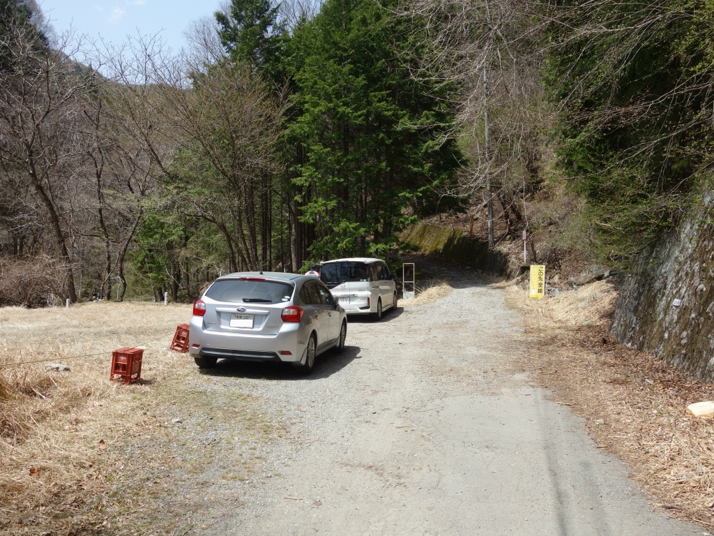 乾徳山南麓の徳和渓谷入口にある路肩スペース(標高910m)。アクセスは中央道の勝沼インターチェンジを下りて国道20号線の東京・大月方面へ向かい、勝沼大橋を渡った先の柏尾交差点を県道38号線の塩山・山梨方面へ左折、すぐにフルーツライン(東山東部広域農道)へ右折して道なりに進み、県道213号線につき当たったら三富・雁坂トンネル方面へ右折する。国道140号線のつき当たりを秩父方面へ右折、徳和入口交差点を県道209号線の徳和方面へ左折して乾徳公園前の駐車場をさらに奥へ進むと舗装路の終点に駐車スペースがある。乾徳山の登山口は車道を850mほど進むとあり、徳和渓谷遊歩道は徳和林道を奥へ進む。