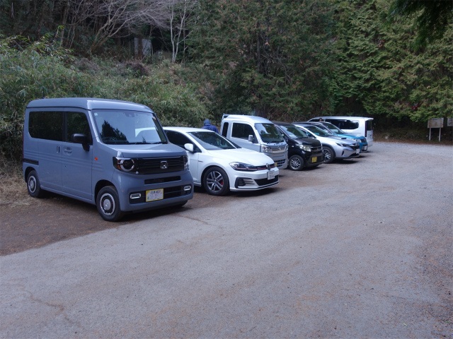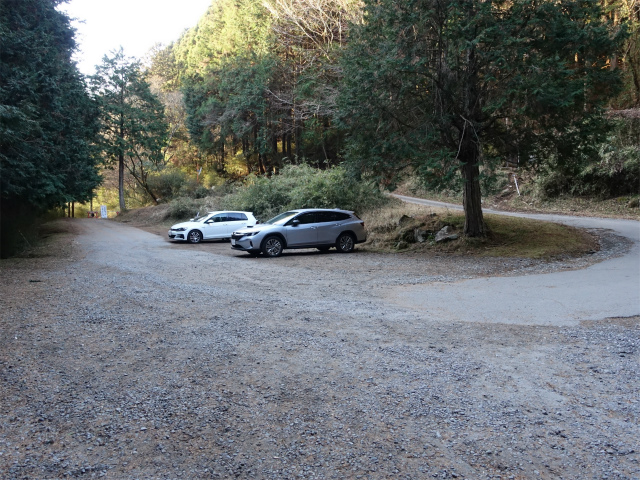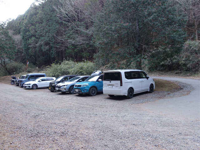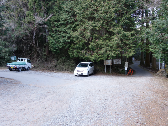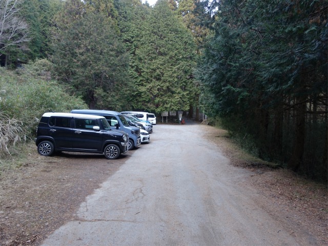 愛鷹山の南方にある水神社付近の長泉林道沿いの駐車スペース(標高520m)。アクセスは新東名高速の長泉沼津インターチェンジを下りて県道87号線のあしたか広域公園方面へ向かい、東名高速を跨いですぐの交差点を右折、続く富士エースゴルフクラブ倶楽部・長泉山荘の案内板で左折、つき当たりを左折して桃沢野外活動センター(駐車場・トイレあり)の前を過ぎて舗装林道を進むと左からの林道合流付近に駐車スペースがある。林道を進むと桃沢橋から位牌岳方面の登山口がある他、さらに先には一服峠や愛鷹山方面の登山口がそれぞれある。