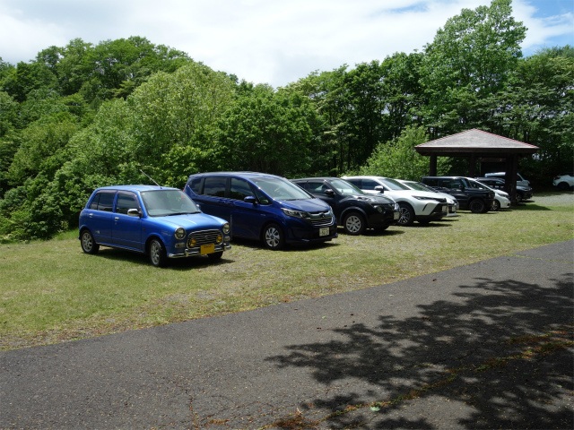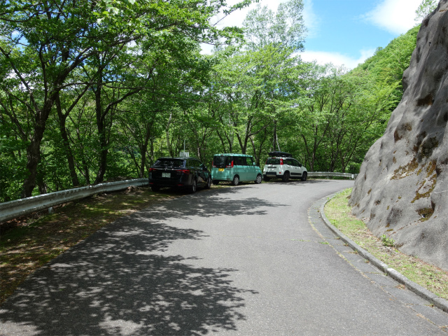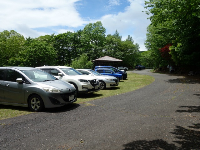 三百名山の袈裟丸山の弓の手コース折場登山口前にある小中西山林道沿いの路肩スペース(標高1190m)。アクセスは北関東道の伊勢崎インターチェンジを下りて国道17号線の前橋・渋川方面へ向かい、すぐの立体交差で側道へ下りて県道73号線の大間々方面へ右折、しばらく道なりに進み大間々町6丁目の交差点で国道122号線の日光・足尾方面へ左折する。渡良瀬川を跨ぐ福岡大橋の手前を左折して国道を道なりに15kmほど進み、小中の交差点で県道268号線の大滝方面へ左折し最奥部の集落先の分岐を直進、小中大滝自然公園を過ぎて郡界尾根登山口との分岐を折場登山口方面へ右折し、さらに林道を進むと右手に東屋とトイレの整備された広場がある。つつじ平からの稜線はツツジが多く、シーズンは駐車スペースも混み合う。