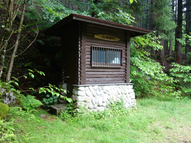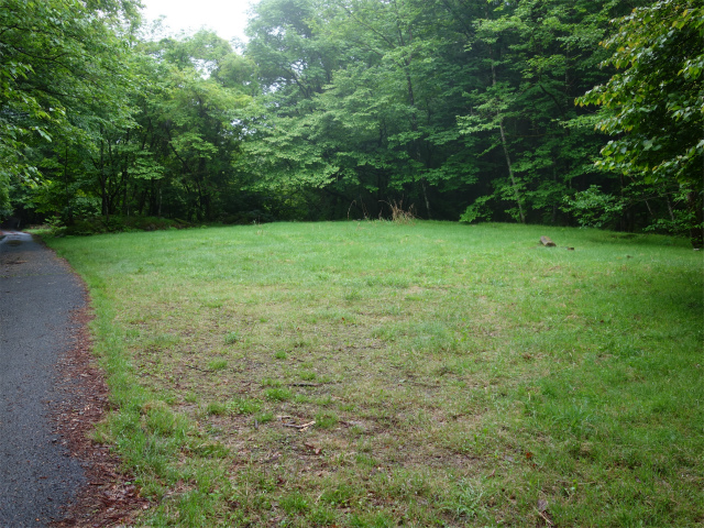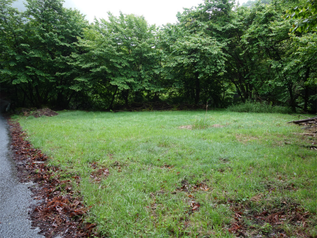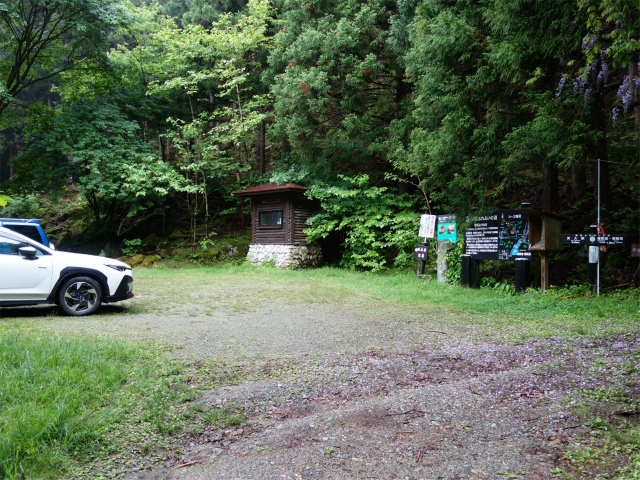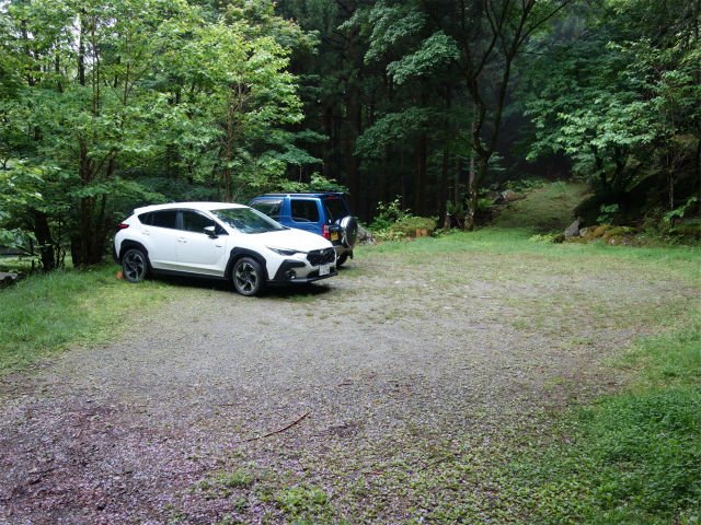 三百名山の袈裟丸山の塔ノ沢コース案内板前にある塔ノ沢林道沿いの駐車スペース(標高820m)。アクセスは北関東道の伊勢崎インターチェンジを下りて国道17号線の前橋・渋川方面へ向かい、すぐの立体交差で側道へ下りて県道73号線の大間々方面へ右折、しばらく道なりに進み大間々町6丁目の交差点で国道122号線の日光・足尾方面へ左折する。渡良瀬川を跨ぐ福岡大橋の手前を左折して国道を道なりに23.8kmほど進み、草木湖を過ぎた先でけさ丸山登山口・寝釈迦の案内板で小中西山林道へ左折、2.5kmほど先の分岐を塔ノ沢登山口方面へ右折すると3箇所にわかれて駐車場がある。林道はいずれも全線舗装されているが、塔ノ沢林道は急勾配で道幅も狭い。