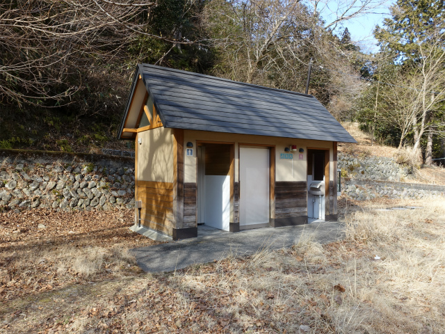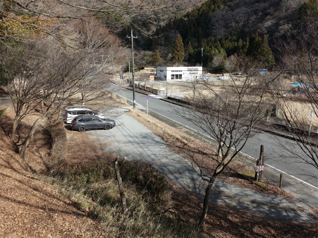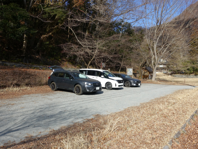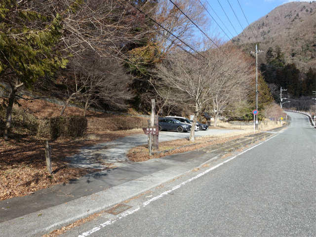 丹沢湖・中川温泉の奥部にある樹齢2000年とも言われる箒杉付近にある無料駐車場(標高465m)。アクセスは東名高速の大井松田インターチェンジを下りて国道255号線の山北・秦野方面へ向かい、籠場インターの交差点を国道246号線の沼津・御殿場方面へ左折、道なりに11.4kmほど進み谷峨駅入口を過ぎた先の清水橋の交差点を神奈川県道76号山北藤野線の中川・丹沢湖方面へ右折、丹沢湖の永歳橋を渡り6.4kmほど進むと左手にある。900mほど先の箒沢公園橋を渡り大石キャンプ場の奥が檜洞丸・石棚山稜の登山口となる。