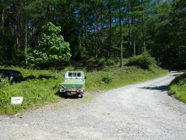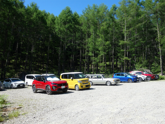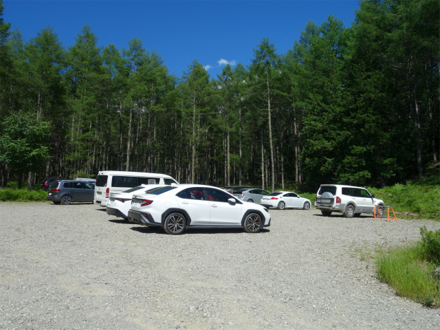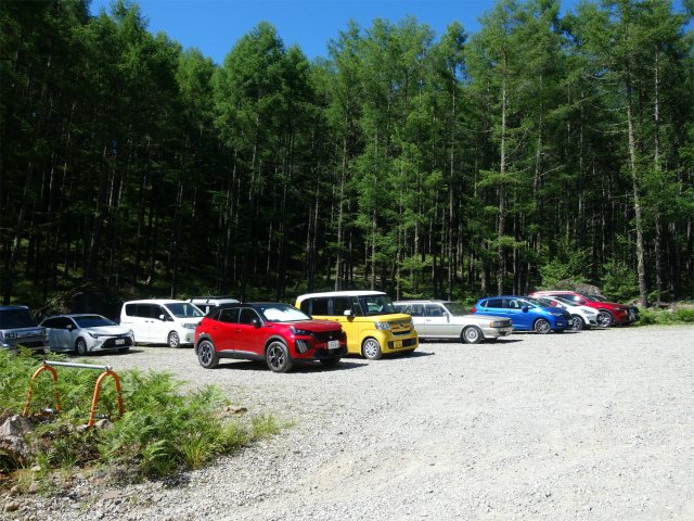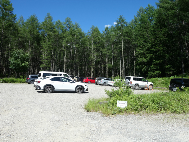 八ヶ岳の夏沢鉱泉へ向かう林道の途中にある無料の駐車場(標高1620m)。アクセスは中央道の諏訪インターチェンジを下りて国道20号線の白樺湖・蓼科方面へ右折、国道152号線との立体交差を側道から左折し7.1kmほど先の山寺上の交差点を県道17号線の富士見方面へ右折、続く南大塩の交差点で尖石遺跡方面へ左折する。道なりに進むと三井の森の別荘地を過ぎて未舗装となり、すぐに唐沢鉱泉との分岐があるので右折してダート路を1.5kmほど進むと左手に整地された駐車場がある。林道は整備されているが凹凸も多く地上高の低い車は走行に注意を要し、また、冬期閉鎖はないものの積雪時は下駐車場より先は走行困難となる。登山口のゲートまでは3kmほど離れているが、桜平上・中駐車場が満車の際や積雪シーズンに利用できる。通年営業の夏沢鉱泉は日帰り入浴も可能で料金は1000円。