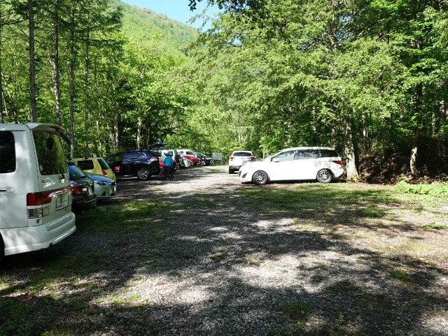 蝶ヶ岳・常念岳の三股登山口へ向かう烏川林道のゲート手前に整備された無料駐車場(標高1280m)。アクセスは長野道の安曇野インターチェンジを下りて白馬・大町方面へ直進、すぐの安曇野インター北の交差点を県道495号線方面へ左折、国道147号線との交差点を直進してつき当たりを県道25号線の大町・穂高方面へ右折し、すぐ先であづみの公園方面へ左折する。公園を過ぎた先のY字路を蝶ヶ岳登山口方面へ右折して道なりに舗装された林道を7.7kmほど進むと道路沿いに駐車スペースが広がる。満車の場合は800mほど手前の第2駐車場(森の広場駐車場)を利用する。ゲートの先を進むと車道の終点に登山指導所があり、蝶ヶ岳と常念岳の登山口が分岐する。