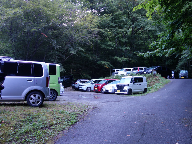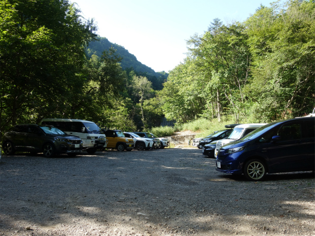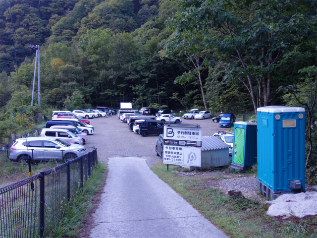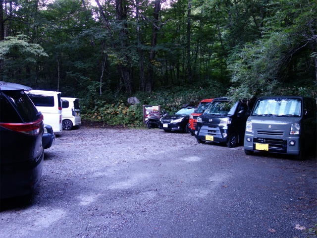 北アルプス3大急登の一つ燕岳・合戦尾根の登山口となる中房温泉の手前にある登山者専用の無料駐車場(標高1390m)。アクセスは長野道の安曇野インターチェンジを下りて高速道路沿いに県道310号線の白馬・大町方面へ直進、柏矢町の交差点で国道147号線の大町・松川方面へ右折、穂高川を渡り北穂高の交差点を県道25号線の中房温泉・穂高温泉郷方面へ左折、道なりに進むと有明荘を過ぎた先の温泉橋を渡った左手に第1駐車場(60台、仮設トイレあり)、手前に第2駐車場(40台)の入口がある。県道327号槍ヶ岳矢村線は12月初旬から4月下旬にかけては宮城ゲートから先は冬期閉鎖となる。第2駐車場の奥が有明山(信濃富士)の登山口となる他、車道を500mほど進むと合戦尾根登山口がある。合戦尾根登山口の奥に中房温泉があり、湯原の湯が日帰り利用も可能で営業時間は9時30分~17時00分(受付16時00分まで)、料金は950円。宿泊・日帰り入浴利用者用の駐車場のうち5台分は事前予約制で4時から宿泊なしでも利用が可能で料金は5000円(入浴2人まで利用可)。