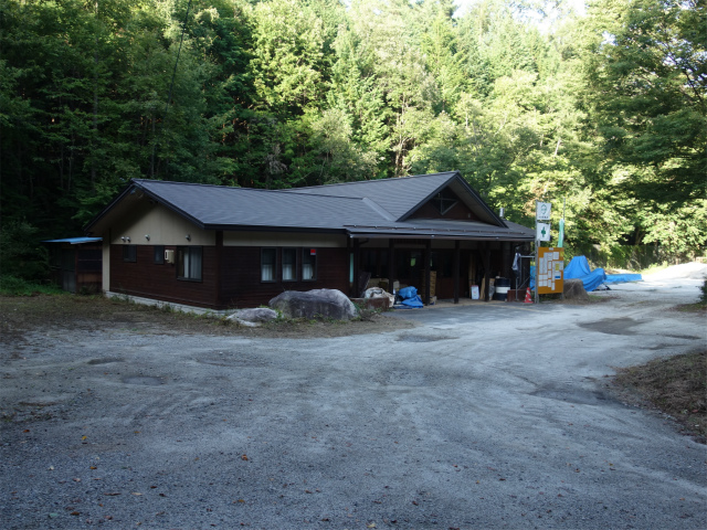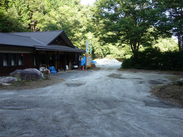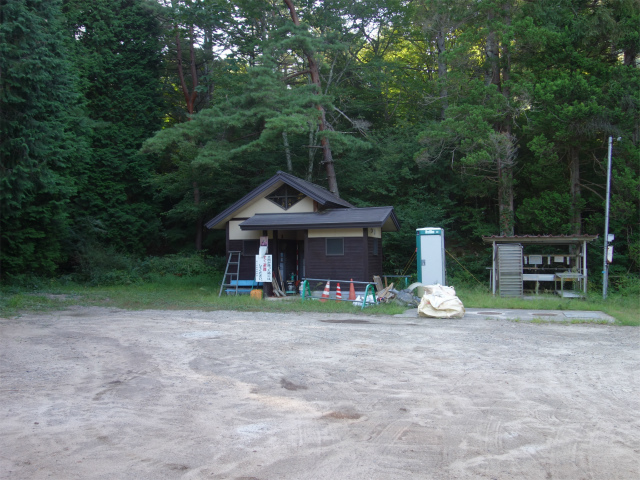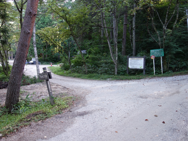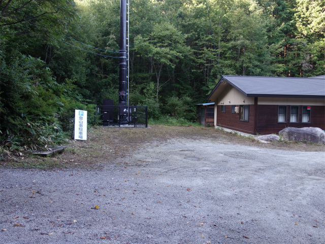 有明山(信濃富士)東麓の馬羅尾高原清流の森にある公営キャンプ場の無料駐車場(標高830m)。アクセスは長野道の安曇野インターチェンジを下りて高速道路沿いに県道310号線の白馬・大町方面へ直進、柏矢町の交差点で国道147号線の大町・松川方面へ右折、JR大糸線の信濃松川駅前の交差点を県道450号線の松川村役場方面へ左折、道なりに進みマレットゴルフ場を過ぎた先の左手にキャンプ場の入口がある。すぐ先の右手にある林遊館前にも登山者用の駐車場がある他、300mほど手前の運動広場にも舗装された駐車場(35台)がある。雨引山の登山口は馬羅尾林道を750mほど進んだ先にあり、付近の林道の路肩にも数台の駐車余地がある。